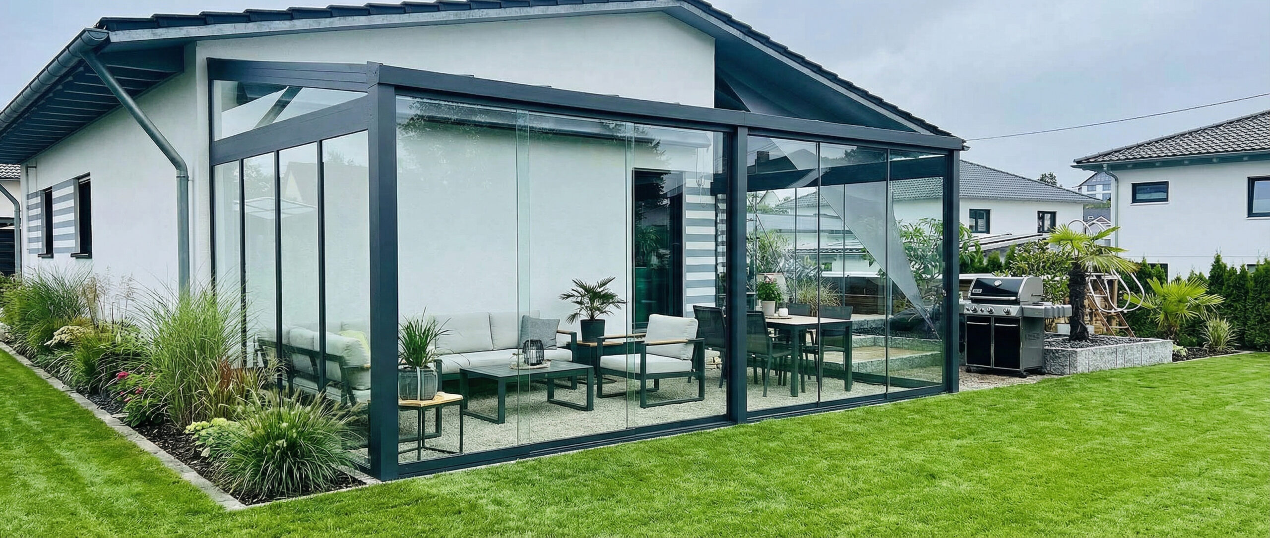Die Verglasungen ermöglichen, dass Sie Ihren Außenbereich je nach Jahreszeit anpassen können. Offene Elemente lassen Licht und Luft herein, eine geschlossene Glasschiebewand bietet der Terrasse Schutz und Geborgenheit. So entsteht ein Lebensraum, der flexibel genutzt werden kann und das ganze Jahr über Freude bereitet. Gerade an windigen oder regnerischen Tagen sorgen die Systeme für ein angenehmes Mikroklima. Gleichzeitig bleibt der Ausblick auf Garten oder Landschaft erhalten, was für eine entspannte Atmosphäre sorgt.